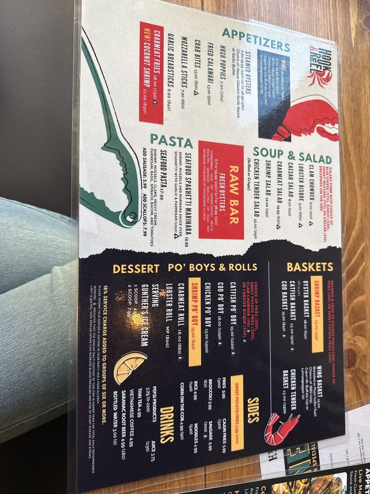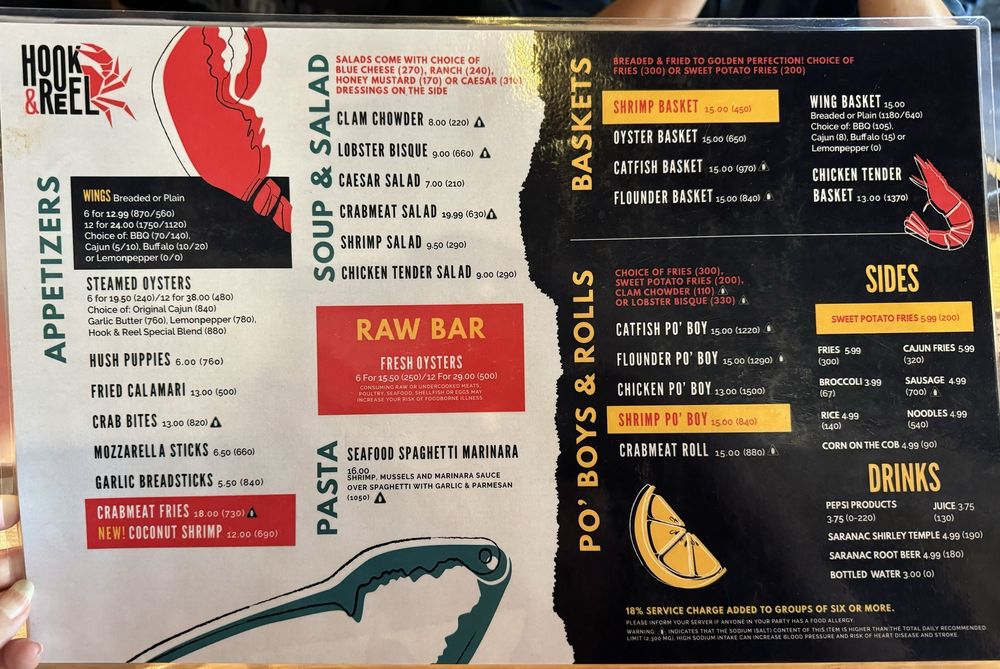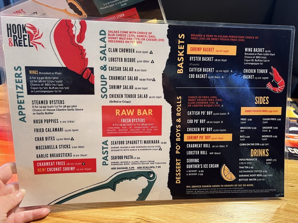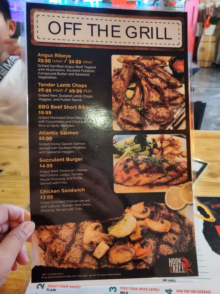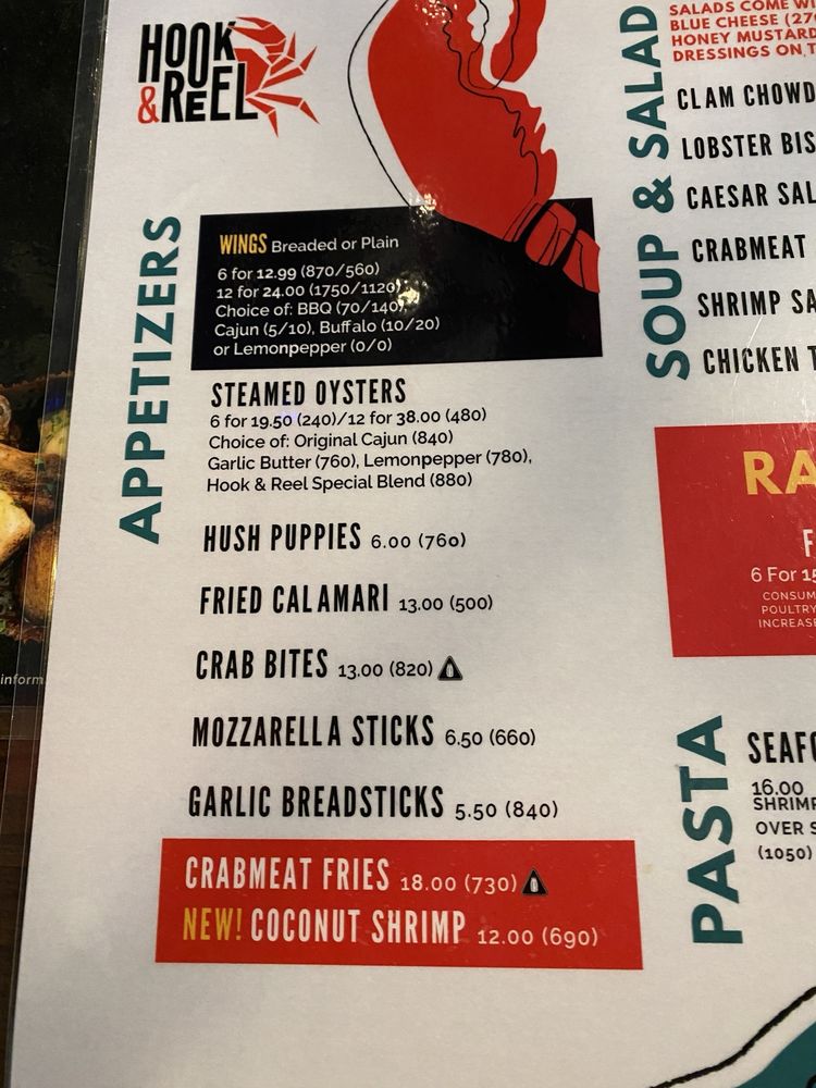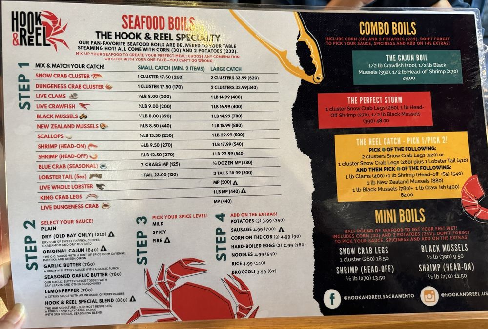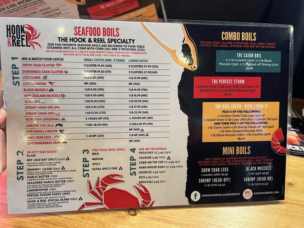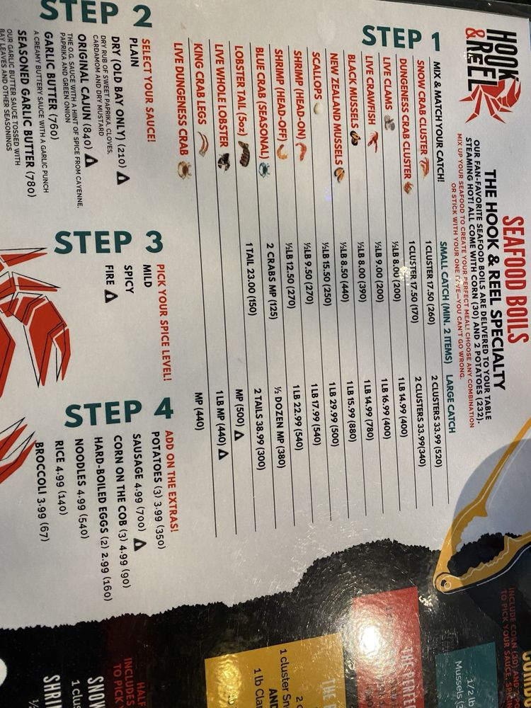 Snow crab ( cluster) (), lb head of shrimp (), / lb black mussels (). select your sauce choose from dry (old bay only): dry rub or sweet paprika, cloves, cardamom and dry mustard; original cajun: the og sauce with a hint of spice from cayenne, paprika and green onion; garlic butter: a creamy buttery sauce with a garlic punch; seasoned garlic butter: our garlic butter sauce tossed with bay leaves and other seasonings; lemon pepper: a citrus sauce with an infusion of peppercorns; hook & reel special blend: the h&r signature - our most requested a robust and flavorful sauce with our special seasoning blend.