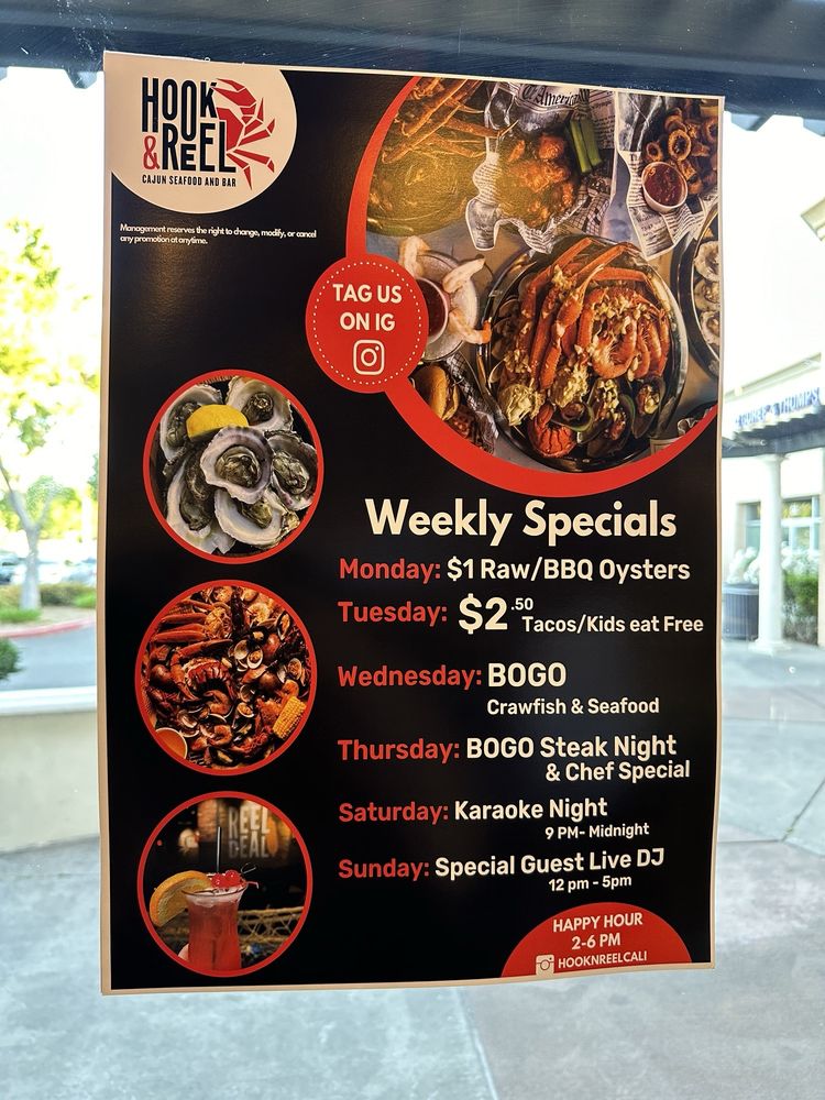 Hook & Reel Cajun in Sacramento, CA is a standout spot for Cajun/Creole seafood with a modern twist. Offering a variety of dishes, from seafood boils to meat options, and a wide selection of cocktails, this restaurant provides a unique dining experience. The menu features flavorful options like garlic noodles with prawns, steamed oysters with garlic butter, and shrimp jambalaya. The atmosphere is lively with TV screens, music, and a disco ball at the bar, making it a great place for a fun night out. The staff is friendly and attentive, providing excellent customer service. Overall, Hook & Reel Cajun is a must-visit for seafood lovers looking for a vibrant and delicious dining experience.